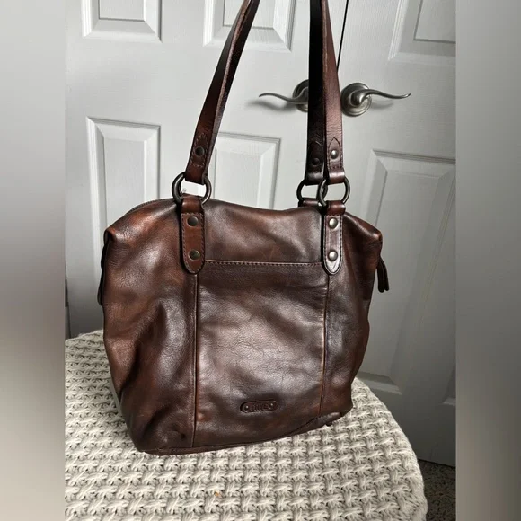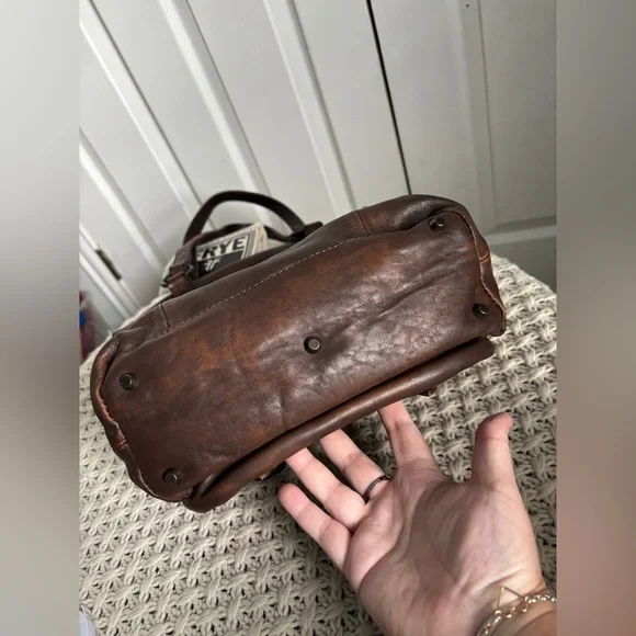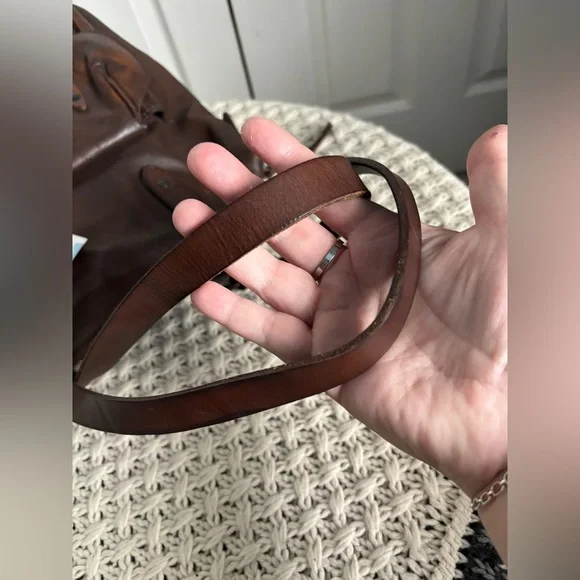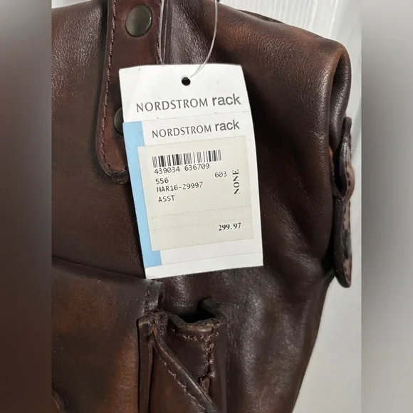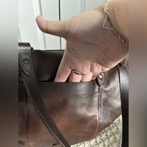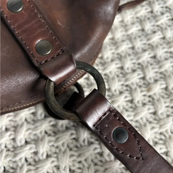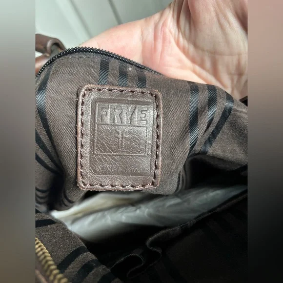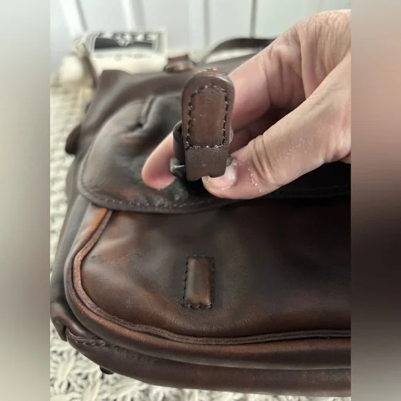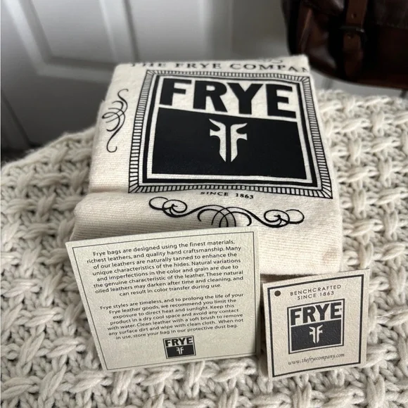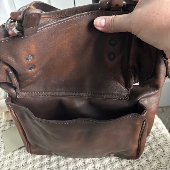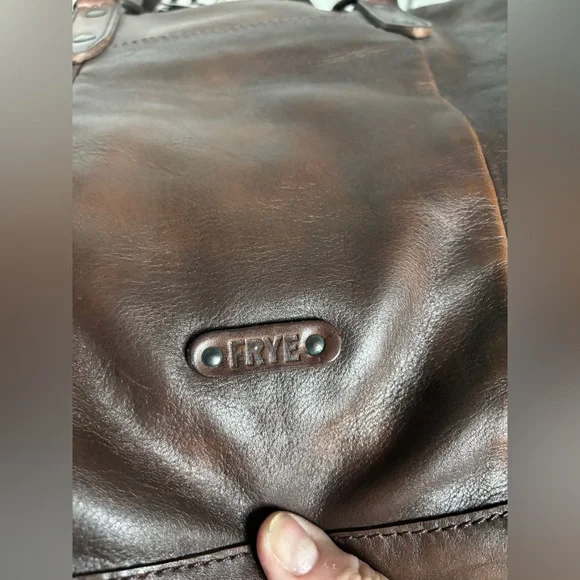 NWT All leather Frye bag.Never used, the original stuffing is still in it.All leather.Some notes:- the buckles on the front pocket are decorative.You can adjust them, but they do not close the pocket.Instead, magnetic closures underneath actually close it.- The leather is gorgeous with natural variations in the color and a distressed look.-It comes with the dust bag.Please review the pics for full condition/description and feel free to ask questions.
